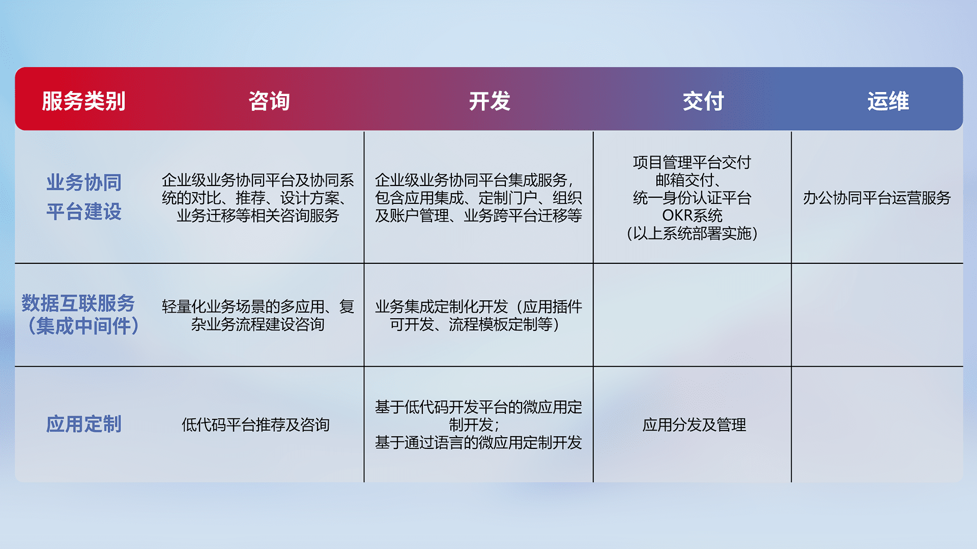 针对钉钉、、企微、、、、IDaas等平台级产品提供产品的规划、、、方案、、交付、、、、定制化开发等服务,,实现如统一协同办公、、智能客户服务、、、、混合会议管理、、、智能数据查询、、、、等业务场景,,实现数字化转型。。。